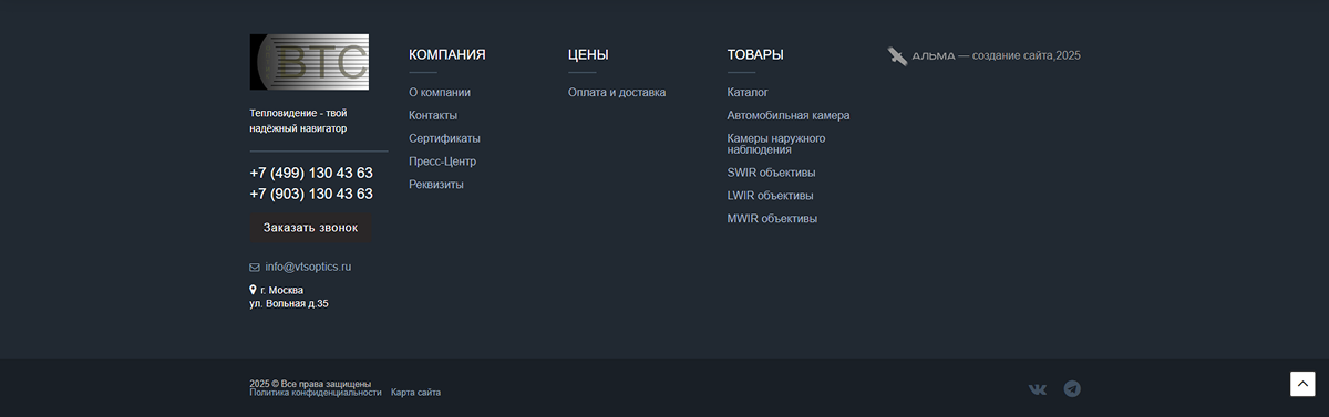 ООО «ВТС» занимает ведущие позиции как поставщик тепловизионных объективов в России. Деятельность компании сосредоточена на комплексных поставках высококачественных оптических решений для тепловизионной техники различного назначения.