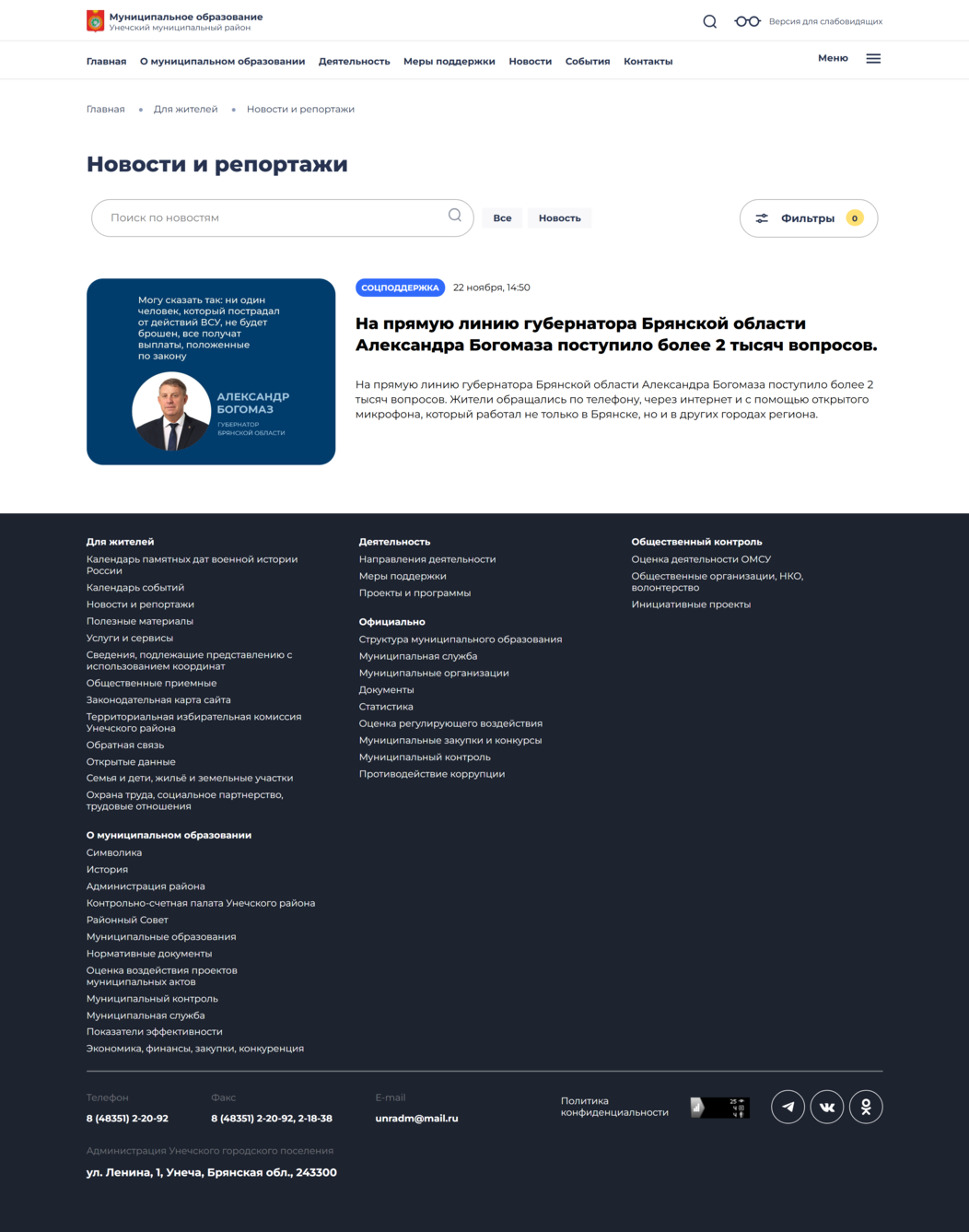 Мы воспроизвели логическую схему сайта Унечского района, сохранив привычный формат подачи информации.