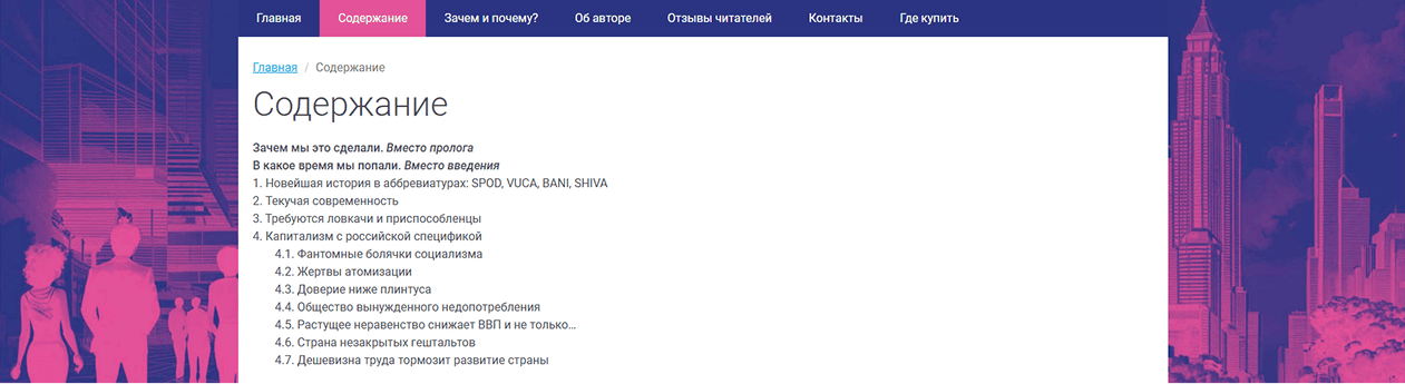 Содержательное наполнение ресурса организовали по принципу постепенного погружения в материал. В разделах Главная, Содержание и Зачем и почему? разместили информацию, непосредственно раскрывающую суть и ценность литературного произведения. Эти разделы знакомят посетителей с основными идеями книги, ее структурой и уникальными особенностями, пробуждая тем самым первоначальный интерес к чтению.