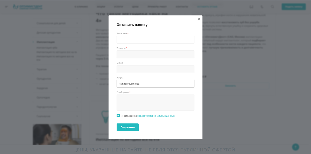 Для сайта медицинского учреждения функция онлайн-записи обязательна. Мы разместили на страницах услуг и врачей заметные кнопки быстрого действия Записаться и Оставить заявку, которые открывают форму обратной связи. Через эту форму пользователь может оставить имя, телефон и комментарий, чтобы клиника связалась с ним для уточнения времени приема и деталей обращения.