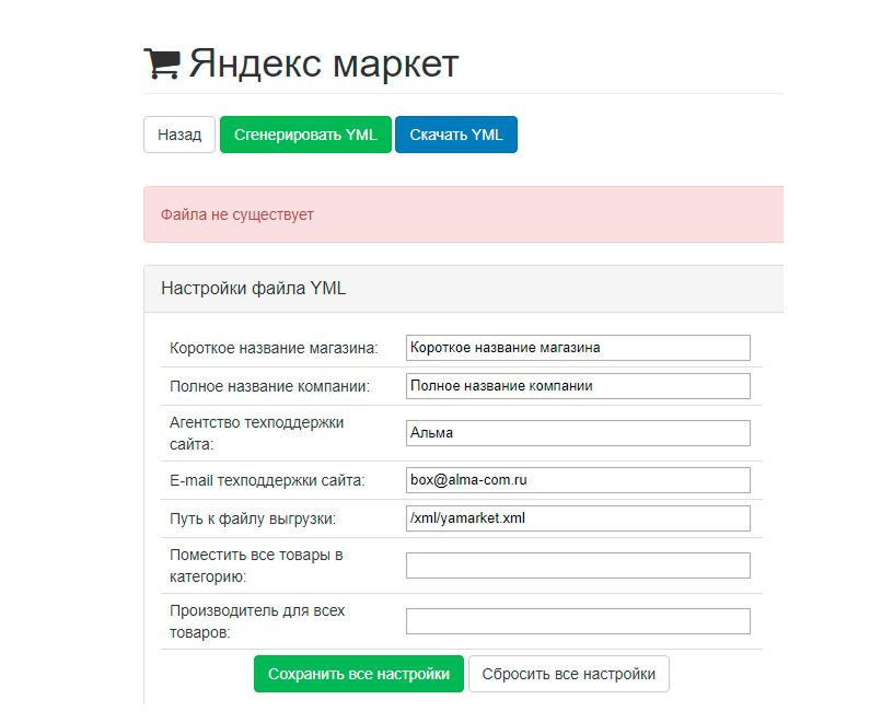 Раздел "Яндекс-маркет" - сгенерировать и скачать YML-файл для загрузки его на Яндекс-Маркет.