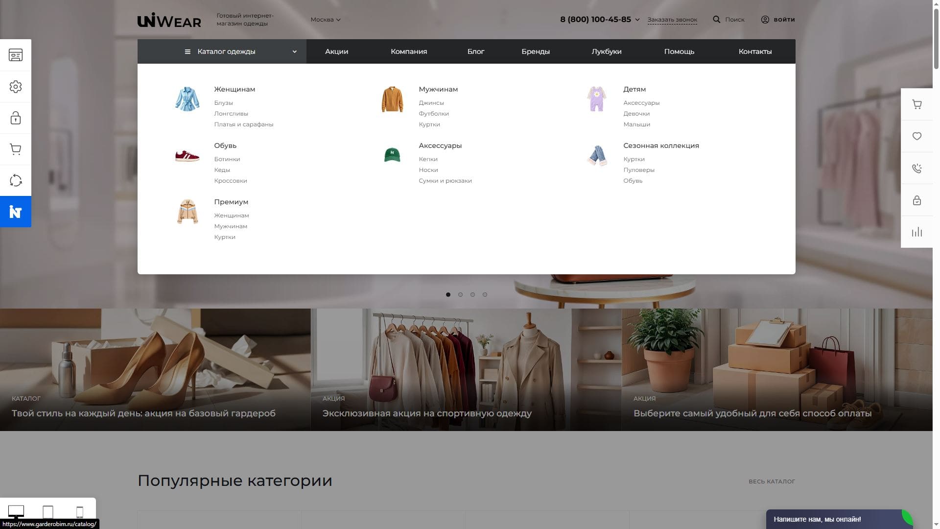 Он позволяет посетителям сконцентрироваться на одежде, без промедлений найти подходящий сегмент. Свою роль в удобном выборе играет и продуманная навигация. Помимо основного горизонтального меню покупатели могут воспользоваться вертикальным.