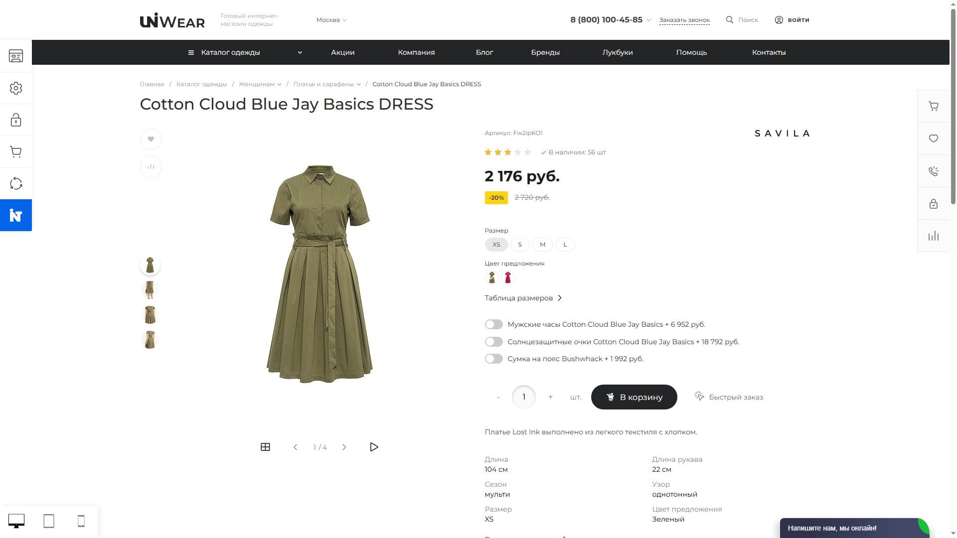 Плюс цепляющие стикеры: “Хит”, “Новинка”, “Акция”. И, конечно, фотографии в левой части страницы, без них невозможно представить современный магазин одежды.